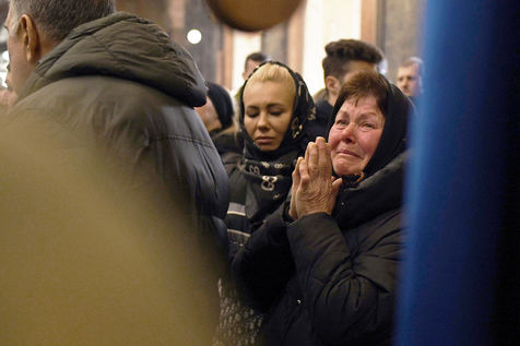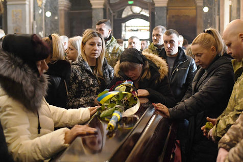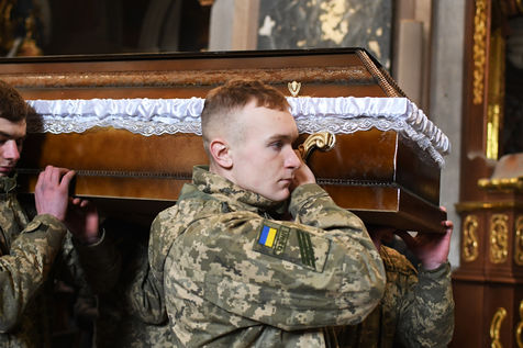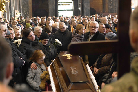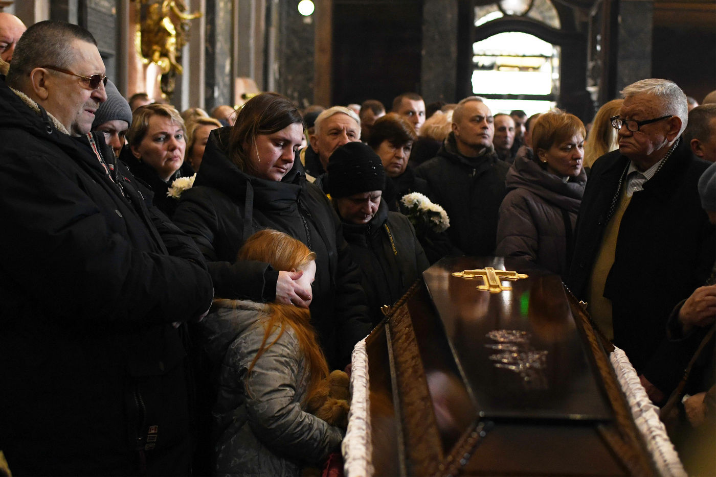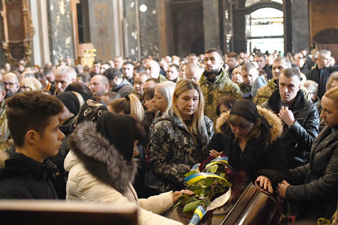 Ce Mardi 15 mars 2022, à Lviv, dans l'église Saint Peter and Paul Garrison, prenaient place les funérailles de quatre soldats ukrainiens morts au front au cours de la guerre entre l'Ukraine et la Russie. Les quatre soldats ont été tués dimanche dans l'attaque de la base d'entraînement militaire de Yavoriv, à l'Ouest de l'Ukraine. L'attaque aurait tué au moins 35 personnes. Après les funérailles, mardi, se sont suivis les enterrements de trois des soldats, Oleg Yaschyshyn, Serhiy Melnyk et Rostyslav Romanchuk. Kyrylo Vyshyvanyi, le quatrième soldat, a été enterré dans sa ville natale, à Duliby, dans la région de Lviv.