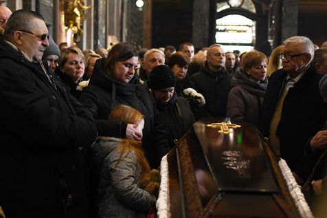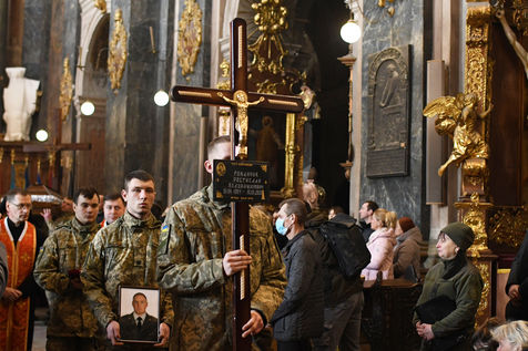 This Tuesday, March 15, 2022, in Lviv, in the church of Saint Peter and Paul Garrison, took place the funeral of four Ukrainian soldiers who died at the front during the war between Ukraine and Russia. The four Ukrainian soldiers were killed on Sunday in a Russian attack on Yavoriv training base in western Ukraine. The attack killed at least 35 people. After the funerals burials were held Tuesday for three soldiers, Oleg Yaschyshyn, Serhiy Melnyk and Rostyslav Romanchuk. Kyrylo Vyshyvanyi, the fourth soldier, was buried in his hometown of Duliby in the Lviv region.