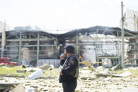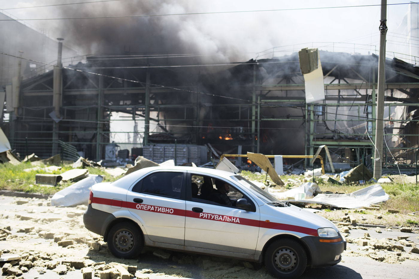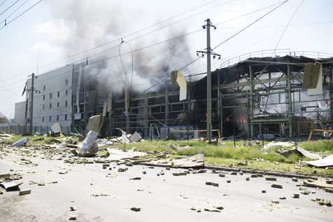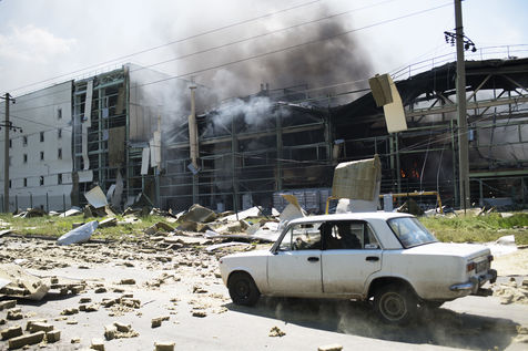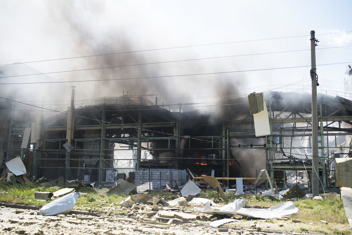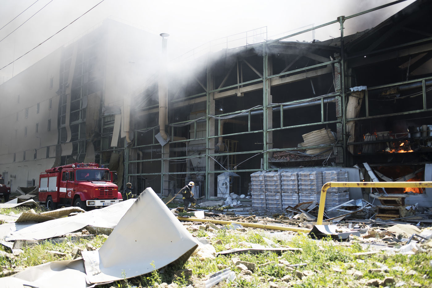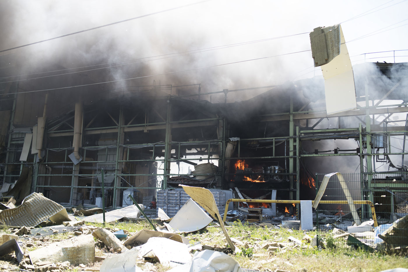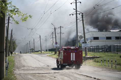À l'Est de l'Ukraine, les russes essayent d'avancer vers Bakhmout. Ce 27 mai 2022 plusieurs missiles ont touché des bâtiments civils de la ville comme cet entrepôt dans la matinée.