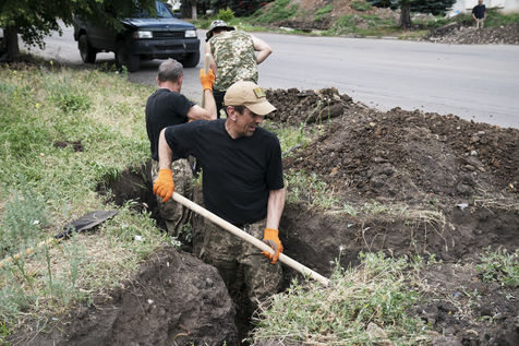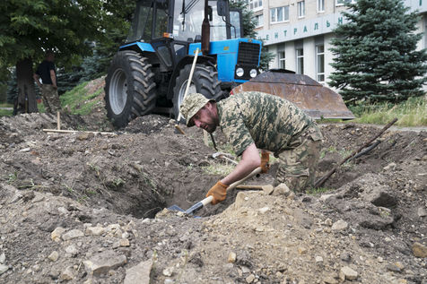 Ukraine : Ukrainian soldiers dig trenches in downtown Lysychansk