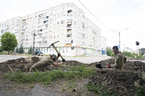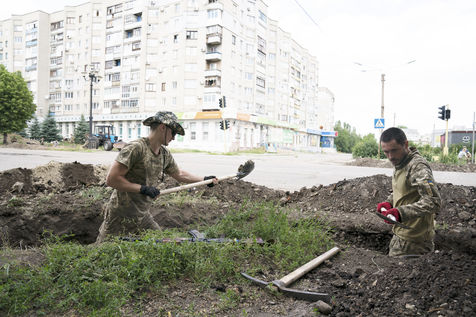 In eastern Ukraine, the Russians are trying to advance to Lysychansk after taking a large part of Sievierodonetsk. Ukrainian soldiers dig trenches in the city center to prepare for the arrival of Russian soldiers. June 16, 2022.