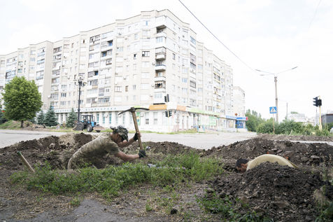 Ukraine : Des soldats ukrainiens creusent des tranchées dans le centre-ville de Lysychansk