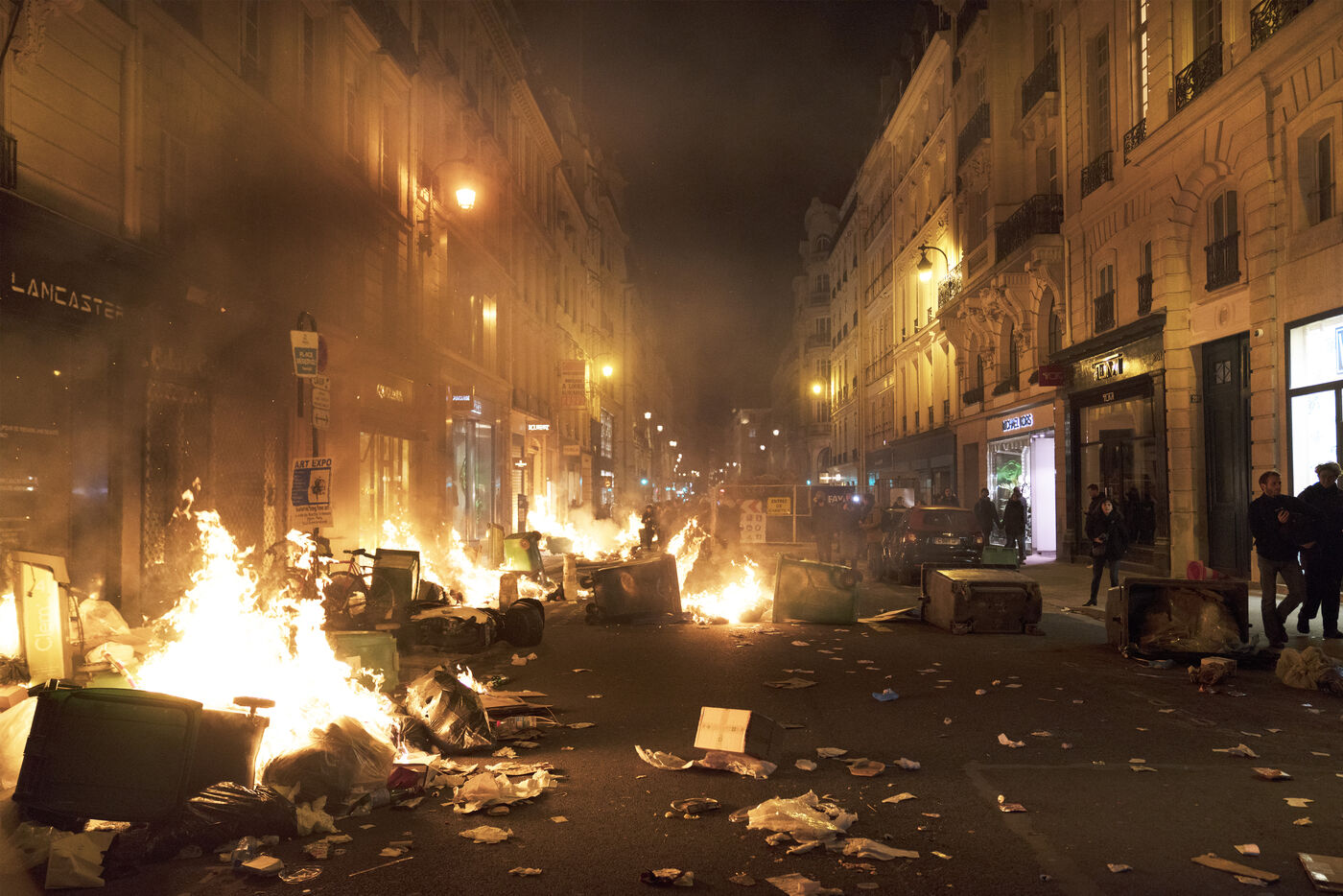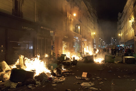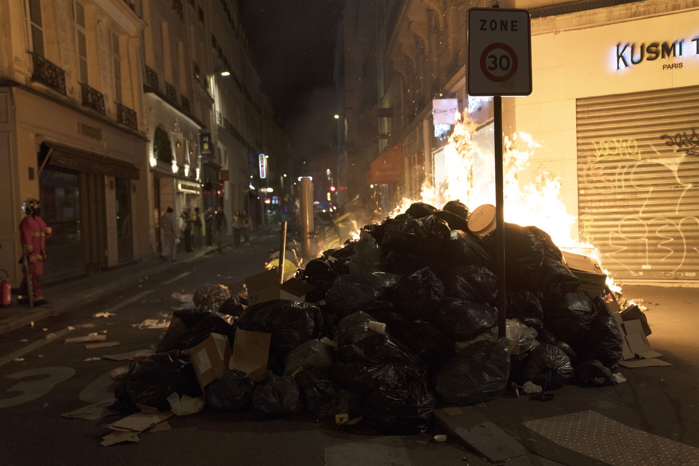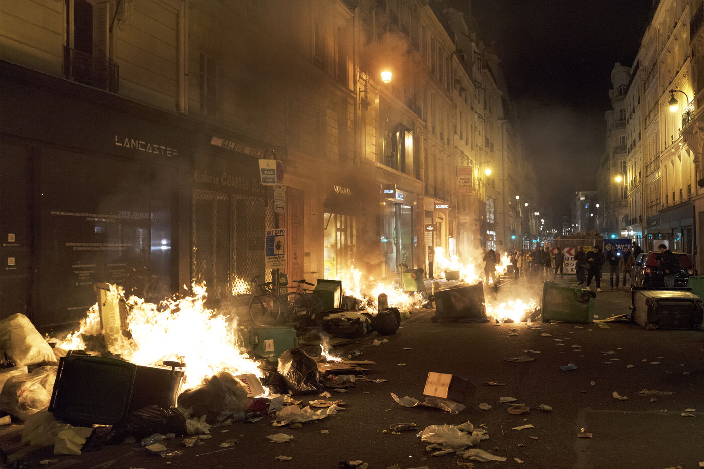 Wild demonstration after the announcement of the use of the 49.3 in the Assembly for the pension reform. Hundreds of fires were lit in the streets of Paris. The demonstrators who had gathered in front of the National Assembly took the street towards the Elysée. The demonstration first stopped at Place de la Concorde before turning into a wild demonstration in the streets of Paris. Thursday, March 16, 2023.