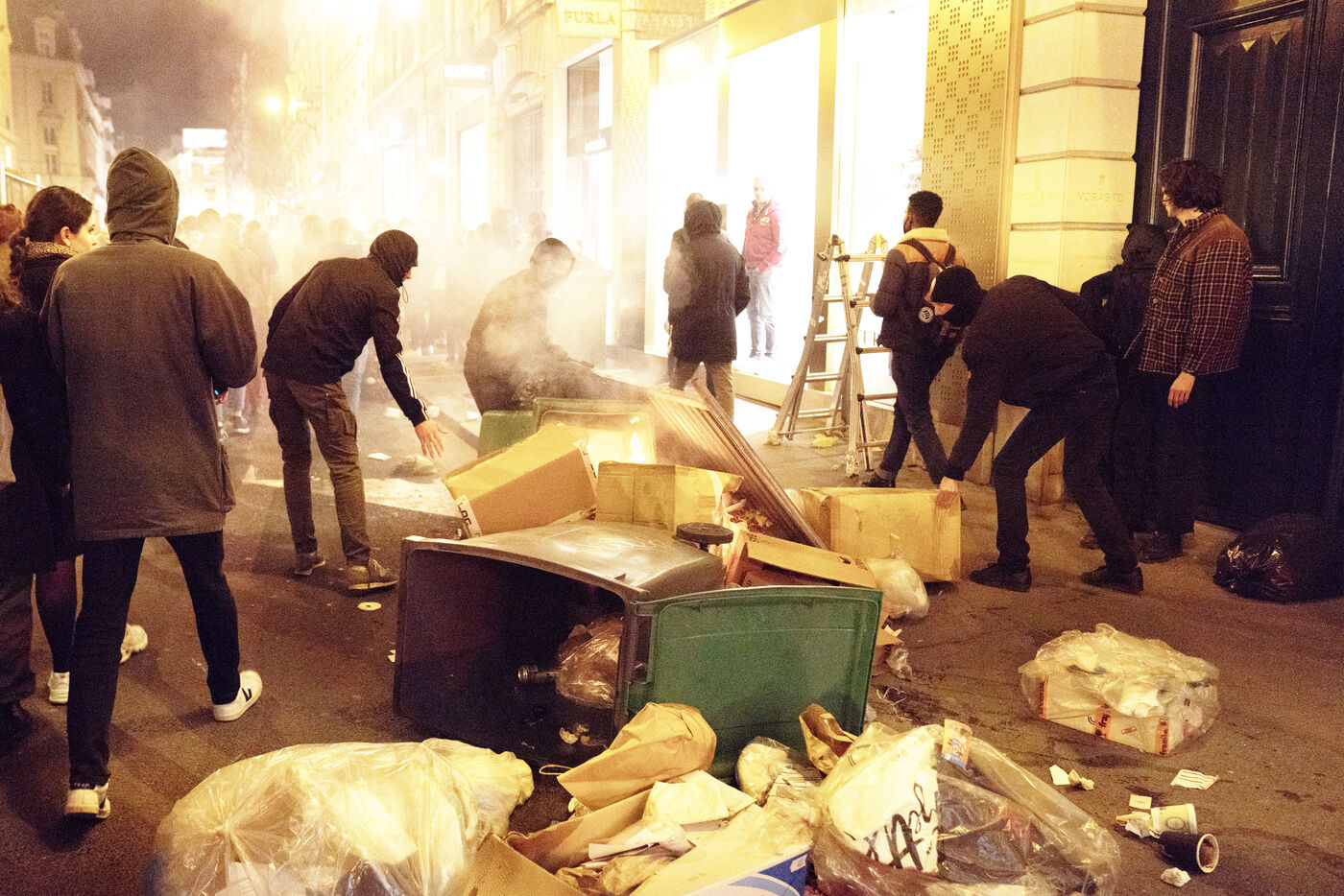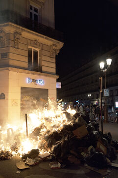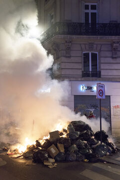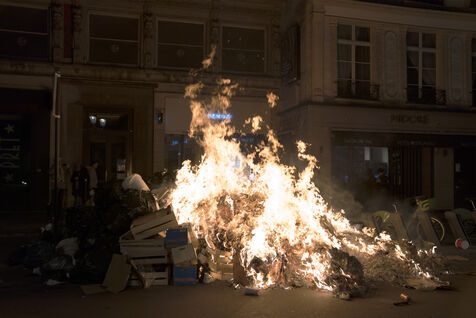 Manifestation sauvage après l'annonce du recours au 49.3 à l'Assemblée pour la réforme des retraites. Des centaines de feux ont été allumés dans les rues de Paris. Les manifestants qui s'étaient réunis devant l'Assemblée Nationale ont pris la rue en direction de l'Elysée. La manifestation s'est d'abord arrêtée Place de la Concorde avant de se transformer en manifestation sauvage dans les rues de Paris. Jeudi 16 mars 2023.