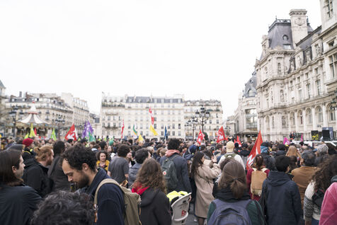 New evening of demonstration against police violence, pension reform and 49.3. Demonstrators took to the streets of Paris again, after the announcement of the use of the 49.3 in the Assembly for the pension reform, but also after the police violence that took place in Sainte-Soline, on Saturday March 25. A rally first took place at the Hôtel de Ville in tribute to the victims of police violence, especially to the two people who fell in coma after the Sainte-Soline demonstration against the mega-basins, then a wild demonstration went through Paris before being stopped at Voltaire. Thursday March 30th 2023.