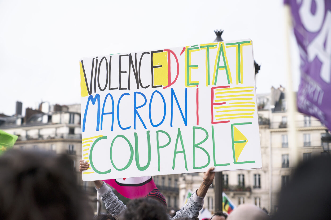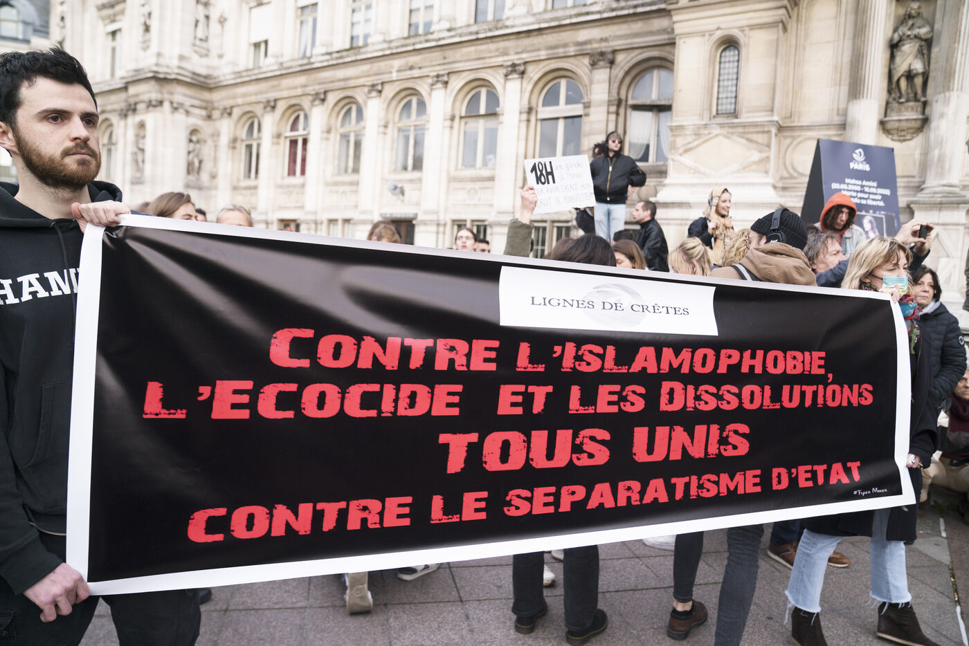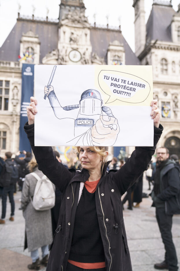 Rassemblement contre les violences policières à Paris, après que plus de 200 manifestants aient été blessés à Sainte-Soline, le samedi 25 mars. Le rassemblement a d'abord pris place à Hôtel de Ville en hommage aux victimes de violences policières, particulièrement aux deux personnes tombées dans le coma après la manifestation de Sainte-Soline contre les méga-bassines, et aux nombreux autres blessés. Ce jour-là, plus de 4000 grenades ont été tirées sur les manifestants par les forces de l'ordre. Une manifestation sauvage a ensuite traversé Paris. Jeudi 30 mars 2023.