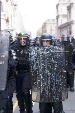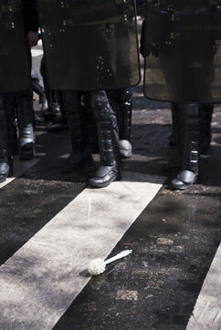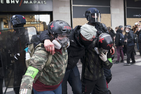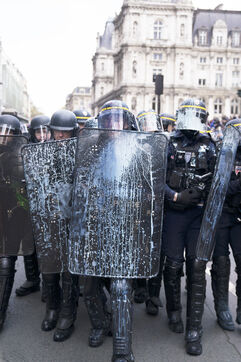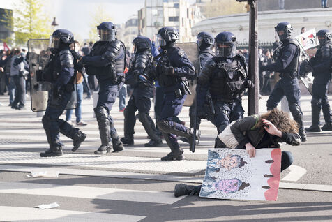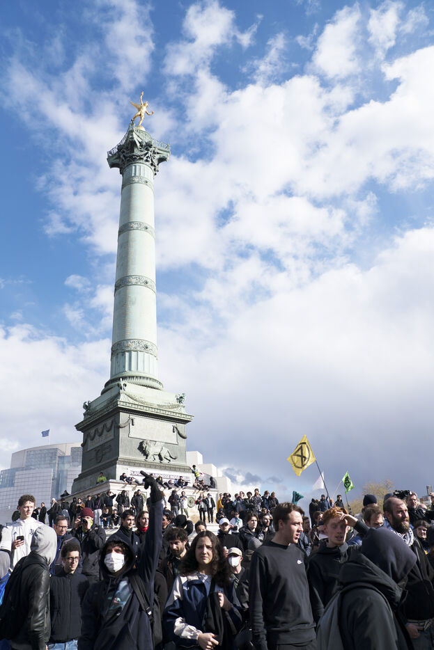 Grève générale et manifestation contre la réforme des retraites et le 49.3. Les manifestants ont de nouveau pris les rues de Paris, pour cette dernière journée de mobilisation avant la décision du Conseil Constitutionnel. La manifestation est partie d'Opéra jusqu'à Place de la Bastille. Nombreux jets de gaz lacrymogènes et charges policières. Jeudi 13 avril 2023.