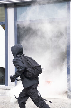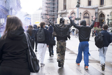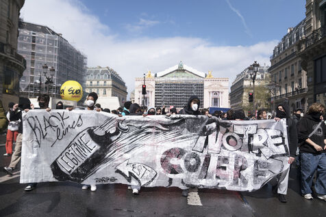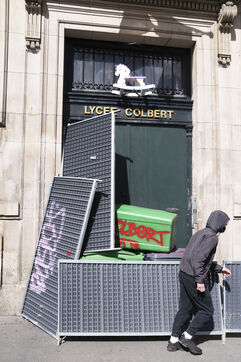 Blockade of the Lycée Colbert and demonstration of high school students for the General Strike day of April 13 against the pension reform and the 49.3. The students then joined the interprofessional demonstration starting from Place de l'Opéra, for this last day of mobilization before the decision of the Constitutional Council. Thursday, April 13, 2023.