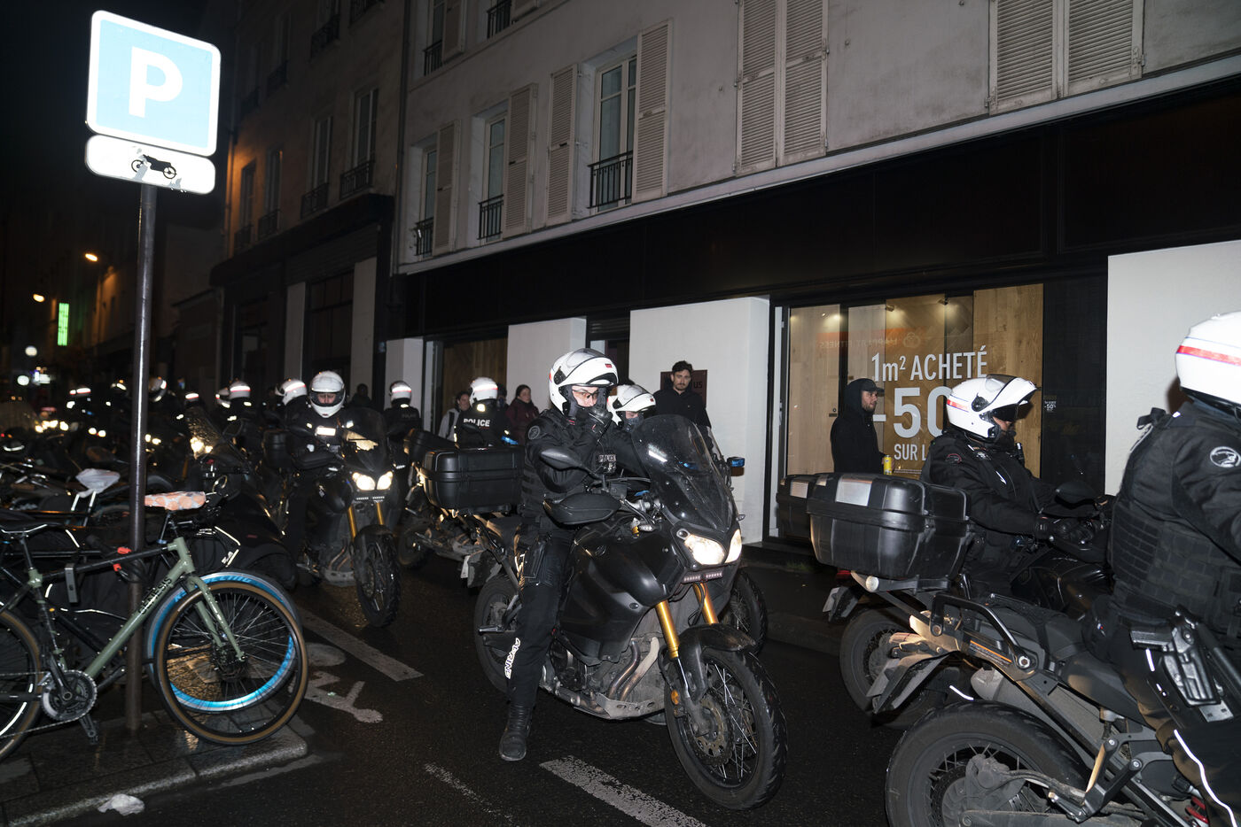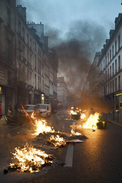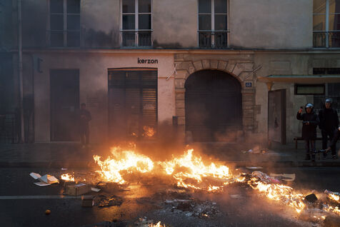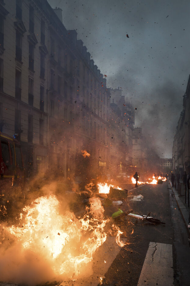 Manifestation après la décision du Conseil Constitutionnel concernant la réforme des retraites. Les manifestants ont de nouveau pris les rues de Paris, allumant de nombreux feux après que le Conseil Constitutionnel ait validé l'essentiel de la réforme des retraites. Vendredi 14 avril 2023.