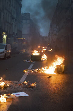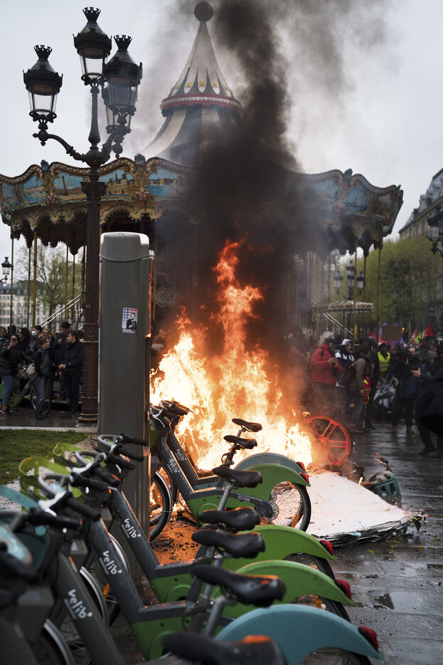 Demonstration after the decision of the Constitutional Council concerning the pension reform. Demonstrators took to the streets of Paris again, lighting many fires after the Constitutional Council validated the main part of the pension reform. Friday, April 14, 2023.