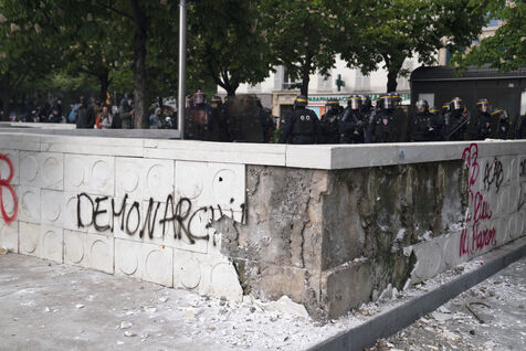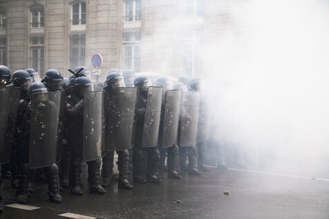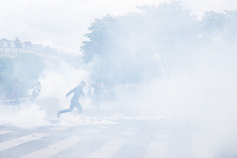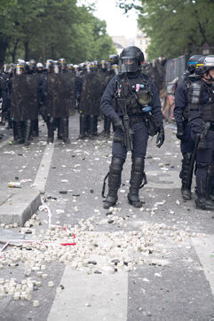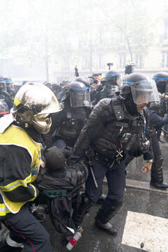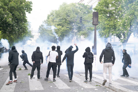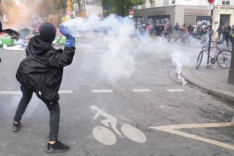 Manifestation du 1er mai pour les travailleurs et la justice sociale à Paris. Les manifestants ont de nouveau pris la rue pour manifester contre la réforme des retraites et pour les droits sociaux. De nombreux affrontements ont eu lieu avec les forces de l'ordre. Entre Place de la République et Nation, le 1er mai 2023, à Paris.