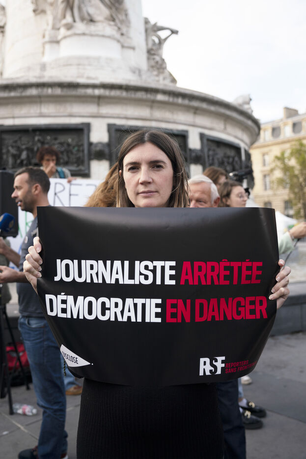 Gathering in support of Ariane Lavrilleux, journalist for Disclose NGO, searched and taken into custody by the DGSI. Around 100 people gathered at Place de la République in Paris on the evening of Wednesday September 20, 2023, as the journalist has been in police custody for over 37 hours. DGSI investigators are accusing her of writing five articles on French arms sales abroad. The protesters and the investigative website Disclose NGO denounce, in addition to the arrest and search of the journalist, a violation of the confidentiality of sources.
