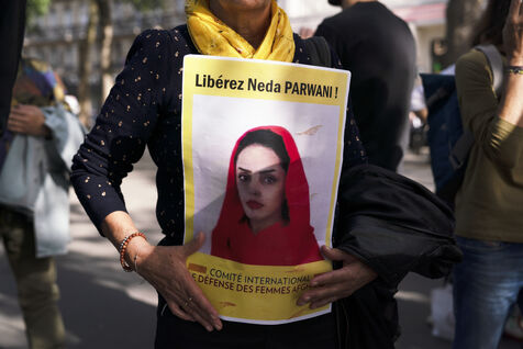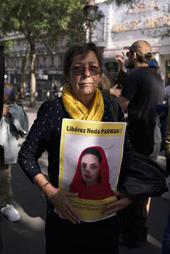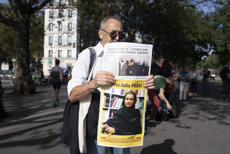 Rassemblement en soutien aux femmes afghanes et pour demander l'asile immédiat pour les femmes afghanes persécutées notamment Julia Parsi et Neda Parwani, place de la Bastille, le 7 octobre 2023.