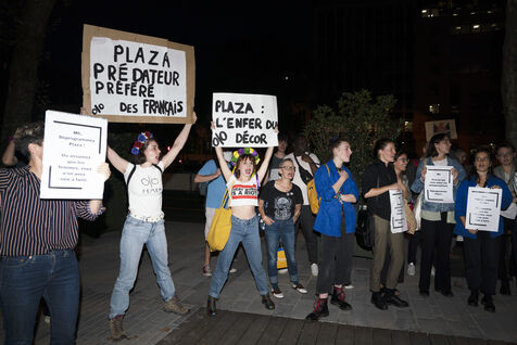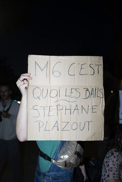 Rassemblement devant les locaux de M6 après les accusations à l'encontre de Stéphane Plaza pour violences conjugales et autres faits graves dans son cadre professionnel, pour interpeler la chaîne TV lui apportant son soutien, qui a notamment décidé de maintenir la diffusion d'un documentaire à sa gloire le 10 octobre au soir, en prime time, après les accusations de trois des ex-compagnes de l'animateur. Le 10 octobre 2023.
