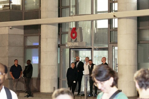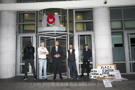 Gathering in front of the M6 offices following accusations against Stéphane Plaza of domestic violence and other serious acts in his professional capacity, to question the TV channel's support for him, which notably decided to maintain the broadcast of a documentary to his glory on the evening of October 10, in prime time, following the accusations made by three of the host's ex-wives. October 10, 2023.