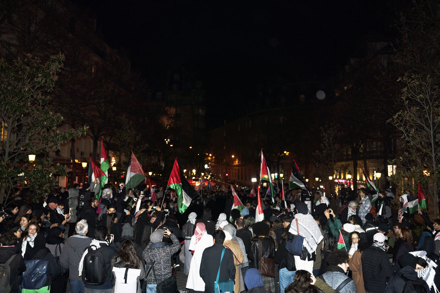 Vigil for Palestine organized by Parisian students. Gathering in support of the Palestinian resistance in the Place de la Sorbonne, Paris, after the recent clashes between Israel and Hamas. Gaza City has been repeatedly bombed and many Palestinians have been killed. November 29, 2023, Paris.