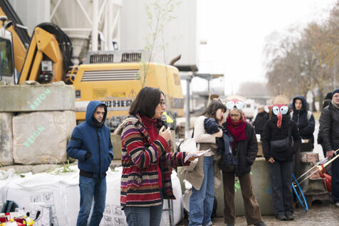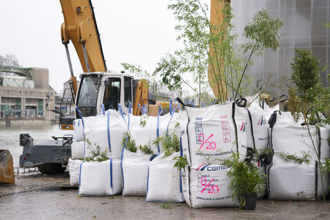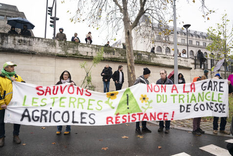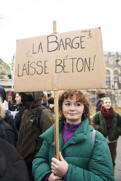 Rassemblement sur les quais de Seine en face des locaux de Lafarge à Bercy pour une action d'occupation dans le cadre des Journées de mobilisation contre le béton dans toute la France. L'action Kermesse Des Terres à l'initiative des Soulèvements de la terre, Attac, Extinction rébellion, Youth for climate notamment a pris la formes d'une occupation, de discours et de concerts. Dimanche 10 décembre 2023, à Paris.