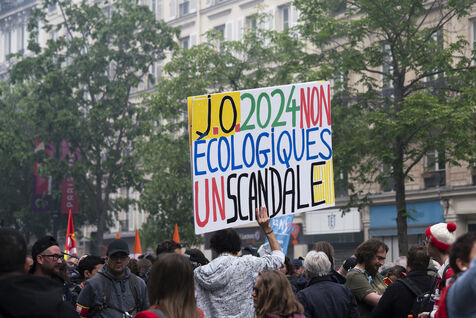 Manifestation du 1er mai 2024 pour les travailleurs et la justice sociale à Paris. Les manifestants dénonçaient notamment les JO de Paris 2024 et manifestaient pour les droits sociaux. Quelques affrontements ont eu lieu avec les forces de l'ordre. Entre Place de la République et Nation, le 1er mai 2024, à Paris.