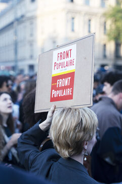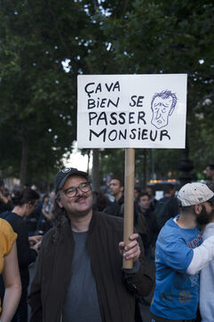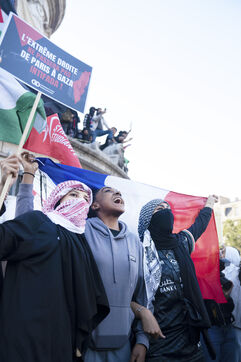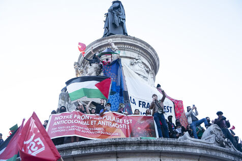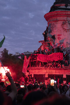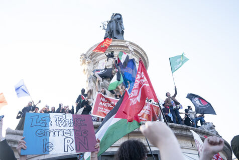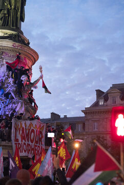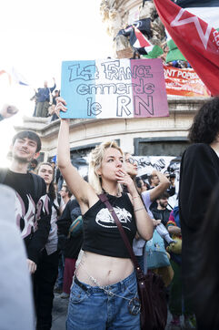 Gathering to celebrate the results of the Nouveau Front Populaire at the legislative elections in Paris. Left-wing supporters gathered on the Place de la République on July 7, 2024, to celebrate their relief at the results of the legislative elections, which had projected the far-right in the lead but ended up coming in third.