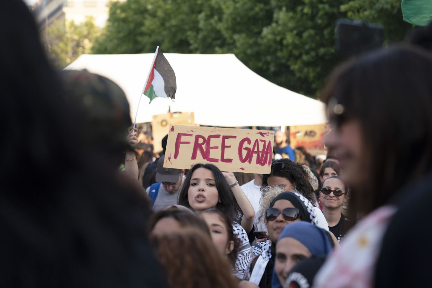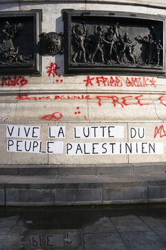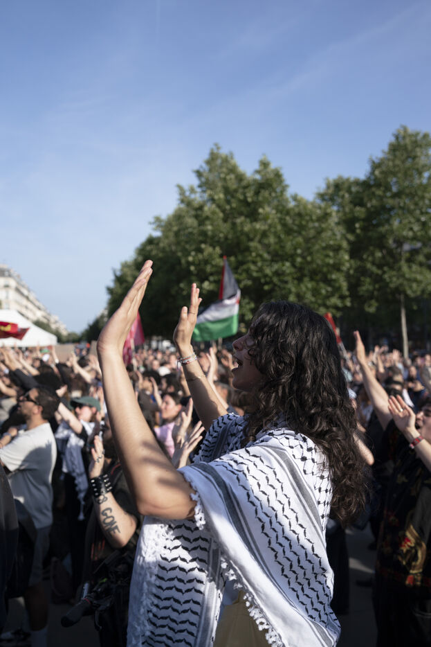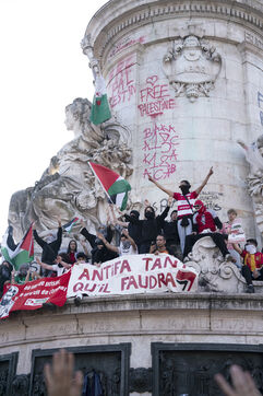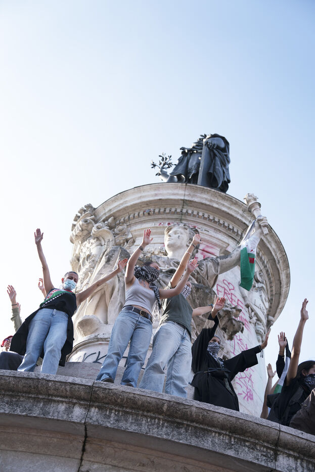 Second evening of rally and occupation in support of the Freedom Flotilla, Place de la République, Paris. The boat carrying 12 pro-Palestinian activists denouncing Israel's humanitarian blockade of the Gaza Strip was spotted and intercepted in waters near Gaza the day before, and the activists have been unable to communicate with the outside world since. Among the 12 activists on board were several French nationals, including MEP Rima Hassan, as well as the young Swedish woman Greta Thunberg. They are activists, humanitarians, journalists and doctors, French, German, Brazilian, Turkish, Swedish, Spanish and Dutch, who left Italy on June 1 to break the Israeli blockade of Gaza. June 10, 2025.