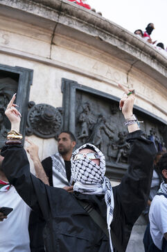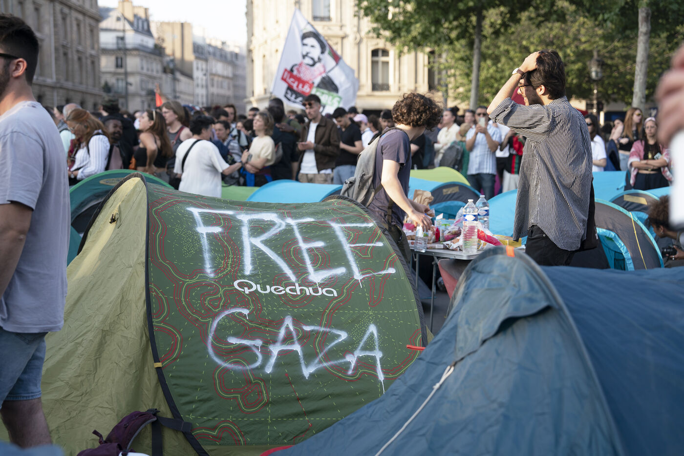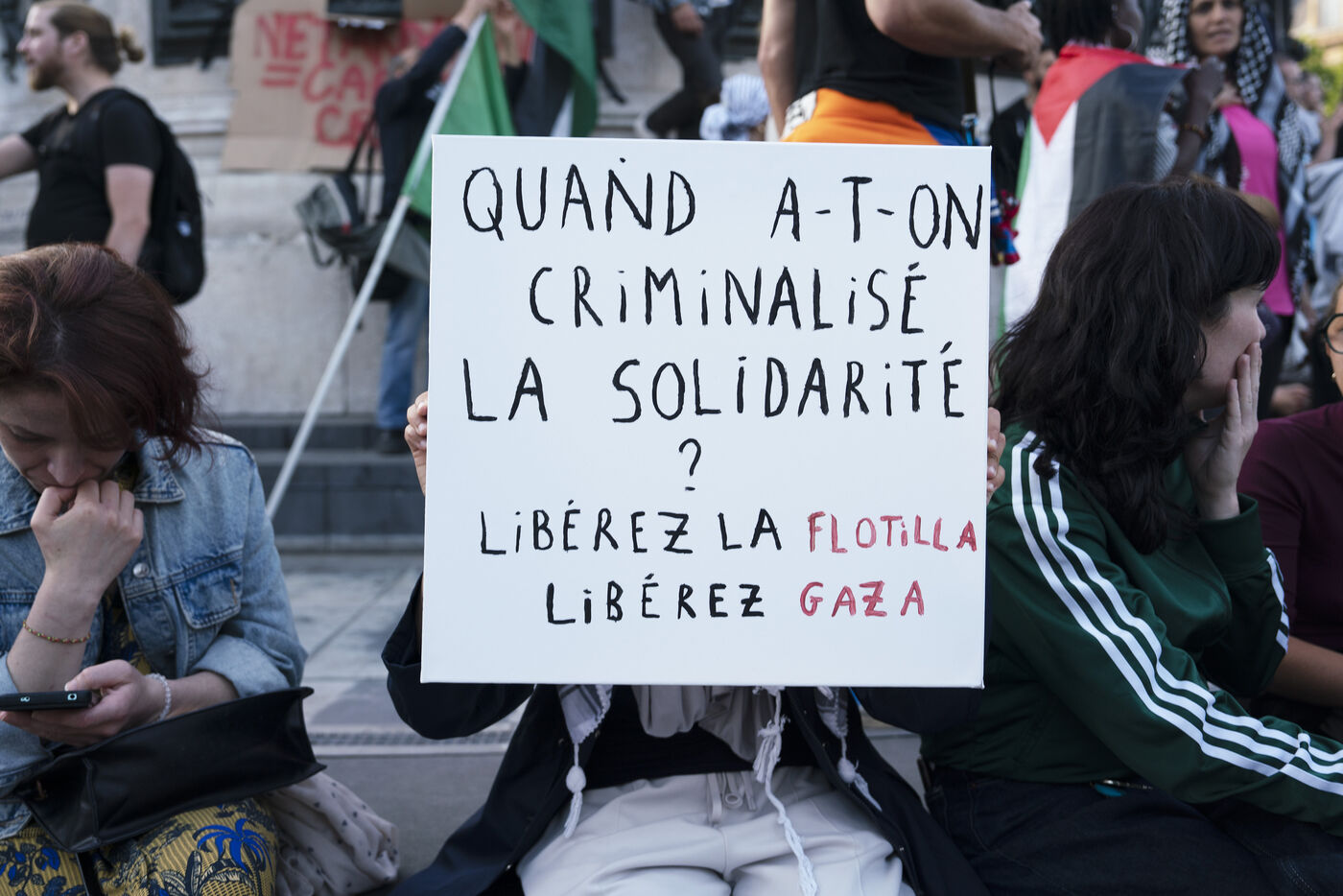 Deuxième soirée de rassemblement et d'occupation en soutien à la Flotille de la liberté, Place de la République, à Paris. Le bateau transportant 12 militants propalestiniens qui dénoncent le blocus humanitaire d'Israël dans la bande Gaza a été repéré et intercepté dans les eaux proches de Gaza la veille, les militants n'ont plus pu communiquer avec l'extérieur depuis. Le bateau comptait parmi les 12 militants plusieurs français dont l'eurodéputée Rima Hassan, mais aussi la jeune suédoise Greta Thunberg. Ils sont militants, humanitaires, journalistes et médecins, français, allemand, brésilien, turc, suédois, espagnol et néerlandais, partis d'Italie le 1er juin pour briser le blocus israélien à Gaza. Le 10 juin 2025.
