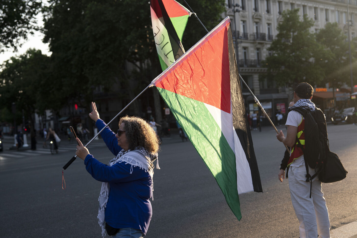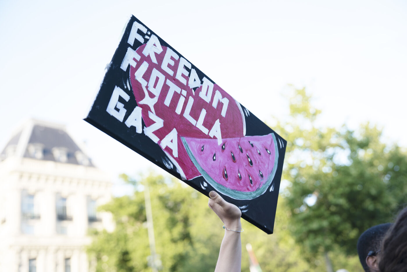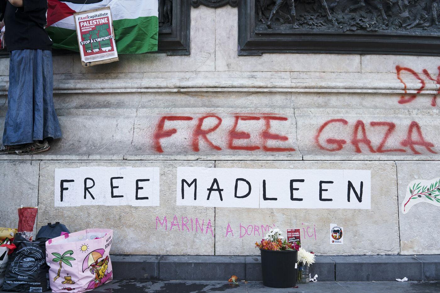 Troisième soirée de rassemblement et d'occupation en soutien à la Flotille de la liberté, Place de la République, à Paris. Le bateau transportant 12 militants propalestiniens qui dénoncent le blocus humanitaire d'Israël dans la bande Gaza a été repéré et intercepté dans les eaux proches de Gaza la veille, les militants n'ont plus pu communiquer avec l'extérieur depuis. Le bateau comptait parmi les 12 militants plusieurs français dont l'eurodéputée Rima Hassan, mais aussi la jeune suédoise Greta Thunberg. Ils sont militants, humanitaires, journalistes et médecins, français, allemand, brésilien, turc, suédois, espagnol et néerlandais, partis d'Italie le 1er juin pour briser le blocus israélien à Gaza. Le 11 juin 2025.