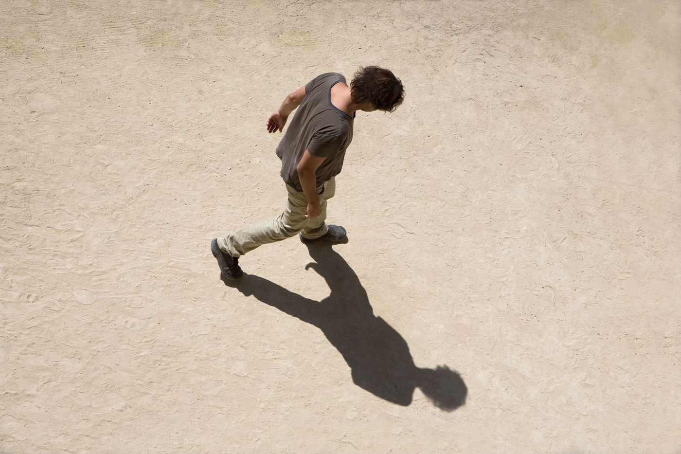 In these photographs of petanque players, the photographer dispossessed the players of the object at the centre of their action. All that remains is the stopped movement, the gesture, the attitude. The persons taken from a bird's eye view look like specimens of insects or butterflies pinned on a board in a museum window.