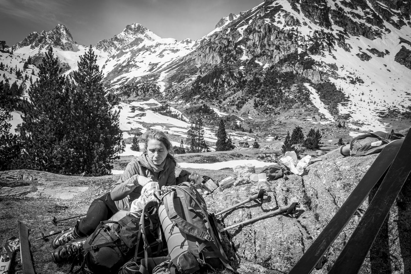Une randonneuse fait une balade à skis de 3 jours dans les Pyrénées. Partie de Cauterets, elle visite les refuges espagnols de Batchimana et Respomuso. Les refuges sont gérés par des gardiens et restent ouverts durant la période de confinement. Elle monte grâce à des « peaux de phoque » collées sous ses skis. Arrivée au sommet elle les décolle pour skier à la descente.