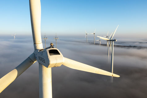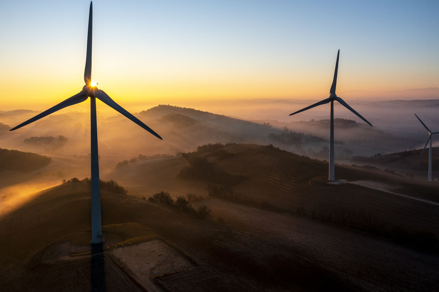 Illustration of wind turbines at sunrise.