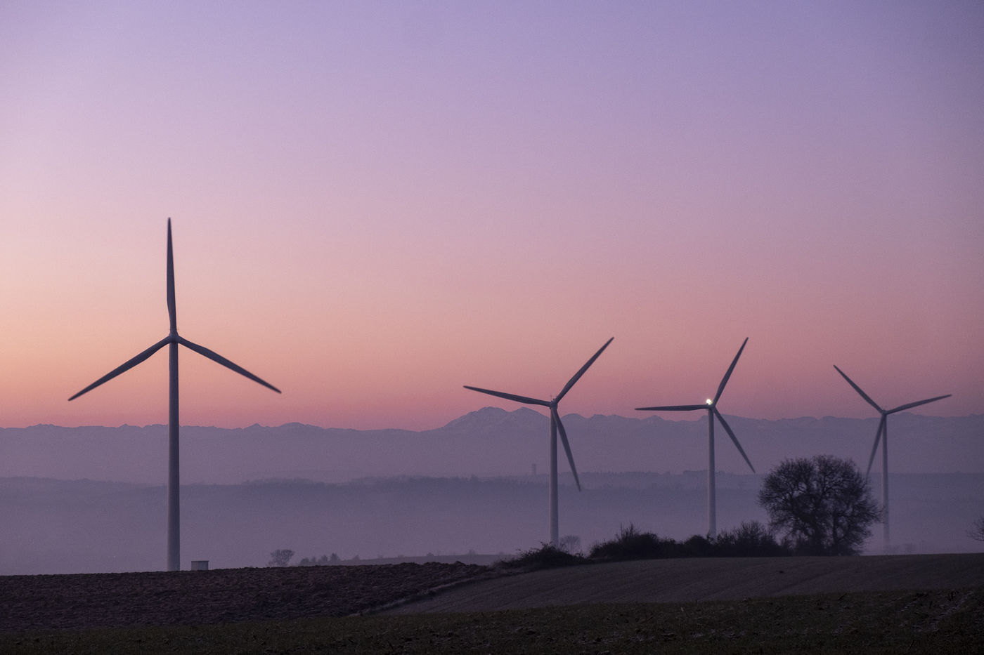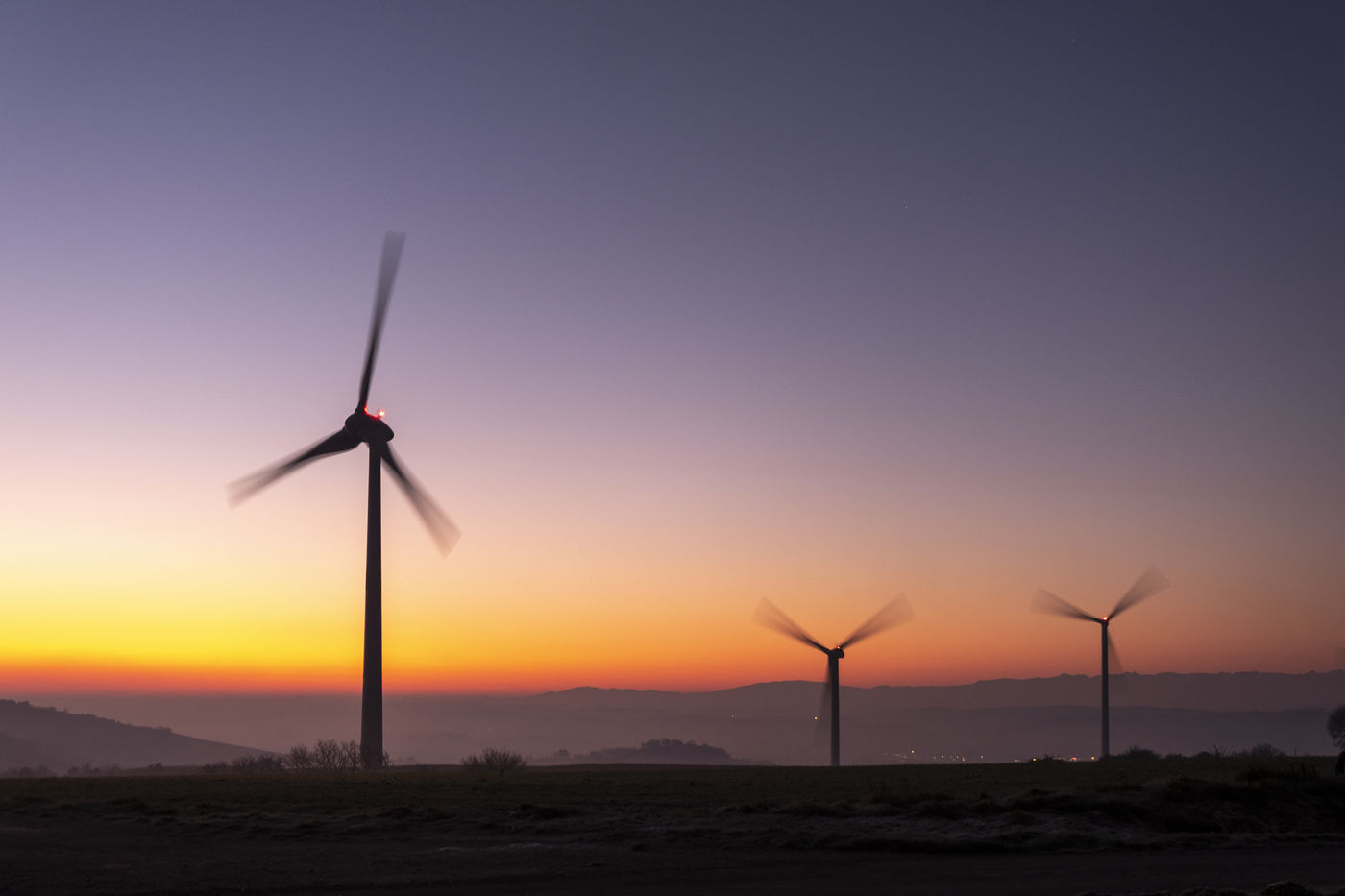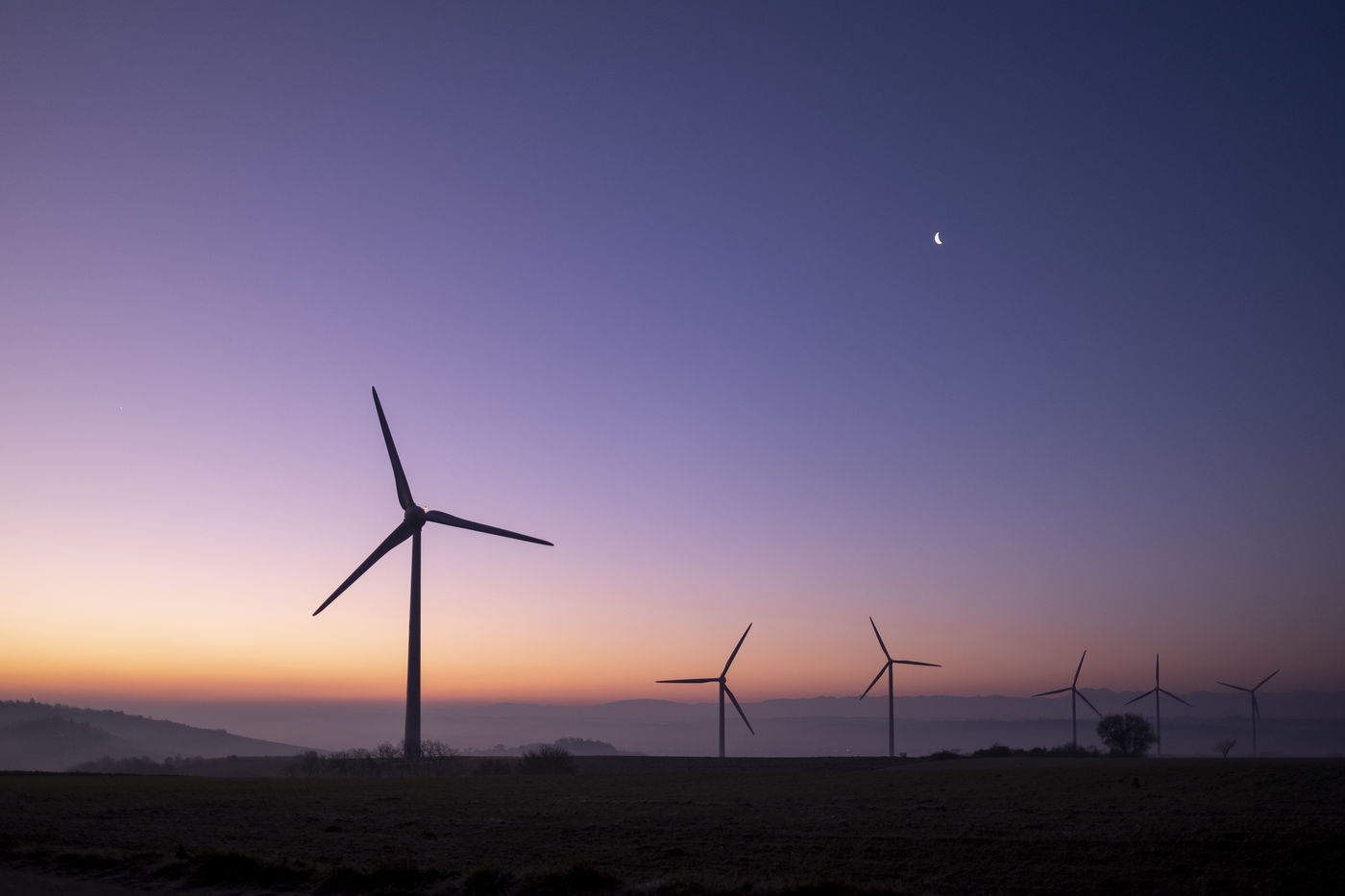 FRANCE - OCCITANIA - ILLUSTRATION OF WIND TURBINES AT SUNRISE.
