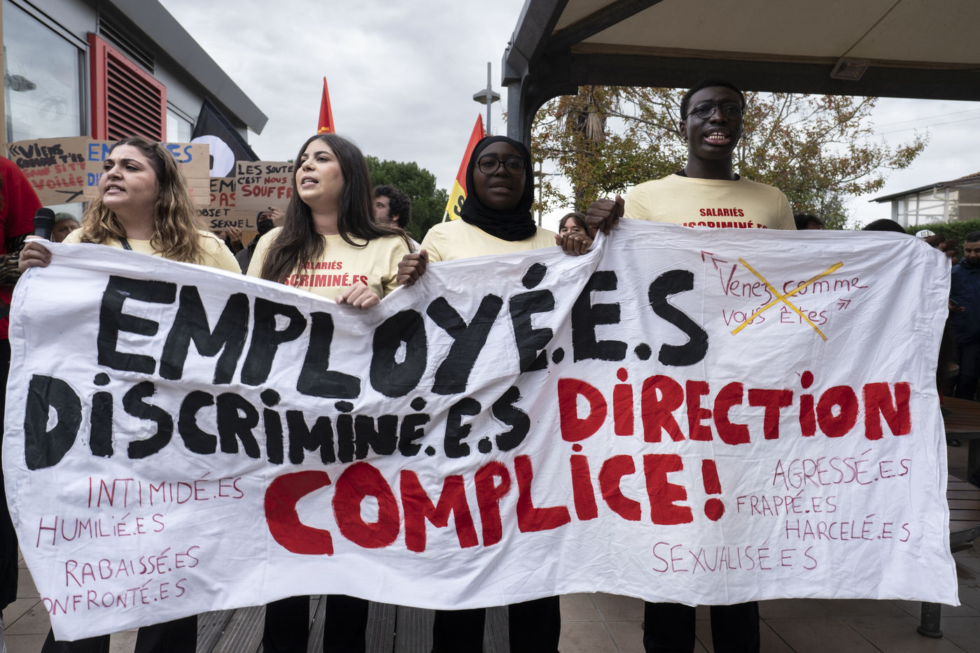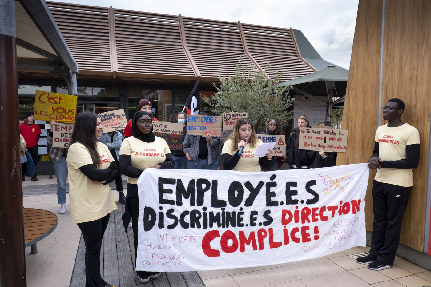 Au restaurant Mac Donald's d'Aucamville, près de Toulouse, des salariés disent subir des violences à caractère sexistes et racistes et homophobes depuis plus d'un an. Des violences physiques auraient également été subies en septembre dernier. Plusieurs alertes ont été envoyées à la direction qui a déclaré avoir pris des mesures avec une mise à pied avant licenciement de l'auteur des faits et le départ d'un des manager qui aurait été déplacé mais pas licencié. Des explications peu convaincantes pour les salariés soutenus par le collectif McDroits qui lutte contre les discriminations au sein de la chaîne et qui accuse la direction de ne pas avoir réagi à des comportements et des actes particulièrement graves malgré des alertes répétées. La CGT, Solidaires, et Révolution Permanente sont également venus apporter leur soutien aux salariés lors de la manifestation.