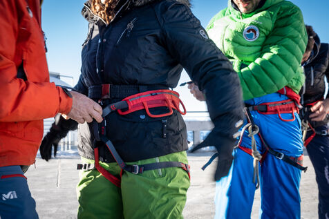 In the Pyrenees, the brand new guide office of the Pic du Midi organises ice climbing sessions. Perched at an altitude of 2,876 m, the Pic is easily accessible by cable car. At the top, the mountain guides equip the participants and introduce them to the practice on a 35-metre high waterfall located just under the glass footbridge above the void, one of the other attractions of the place. Under the feet of tourists and the crampons of climbers, the 1,000-meters-high north face gives an impression of vertigo. The climbers progress on the ice with two ice axes and the front points of their crampons.
