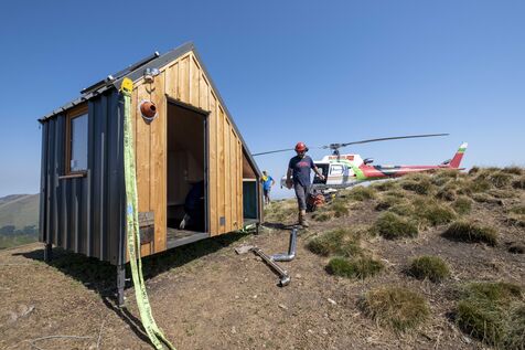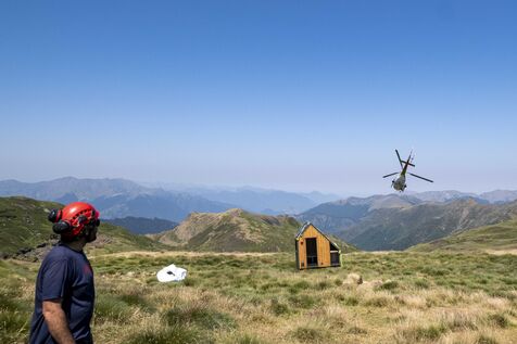 During the summer, Esprit Altitude deploys mobile shelters for shepherds in the Pyrenean mountains. These huts, transported by helicopter to isolated sites or simply by tractor, are installed to facilitate their work on the large summer pastures. They are rented or bought by the communes or the pastoral groups. These cabins allow greater flexibility in the work of the shepherds and come in addition to the traditional cabins. With a living area of 4.5 m2, the shepherd can sleep, eat or heat himself with a mini wood stove. A solar panel, a rainwater recovery system, storage space and a dog house complete the equipment.
