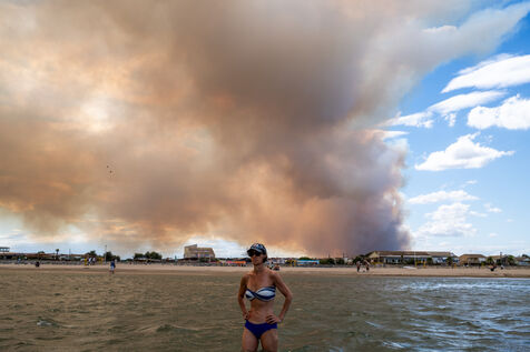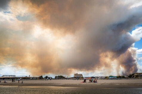 With severe drought conditions and strong winds blowing for several days, forest fires are breaking out daily in the Aude department. Here, the plume of smoke from the Bizanet fire casts a shadow over holidaymakers on Gruissan beach.