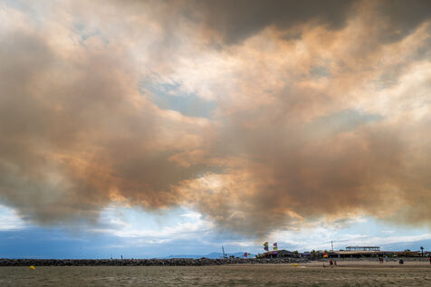 Avec une situation de sécheresse importante et un vent violent qui souffle depuis plusieurs jours, des feux de forets se declenchent quotidiennement dans l'Aude. Ici, le panache de fumée de celui de Bizanet fait de l'ombre aux vacanciers sur la plage de Gruissan.