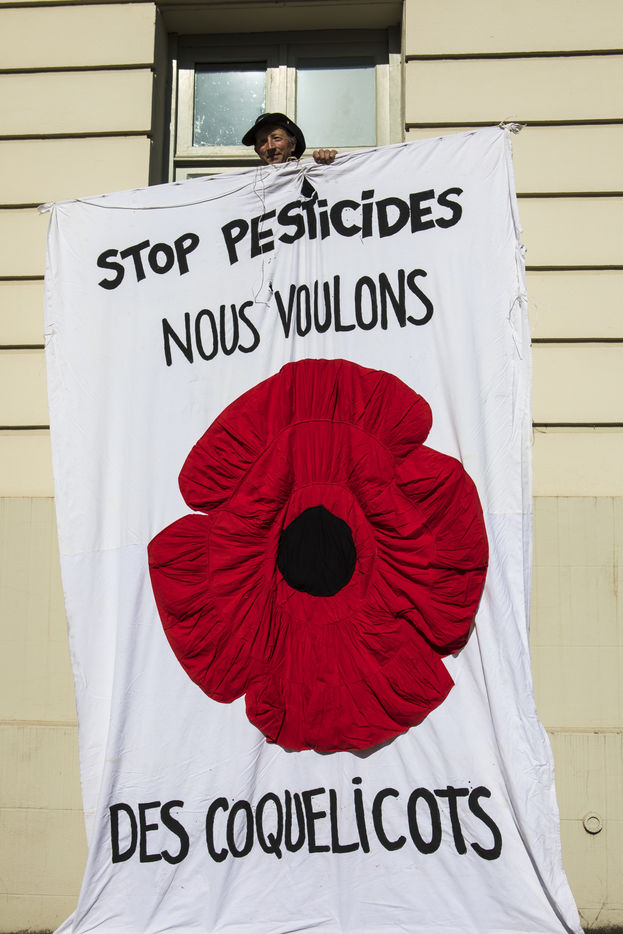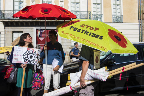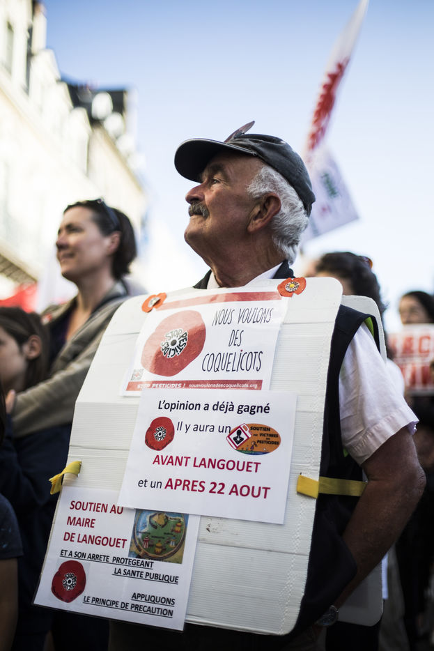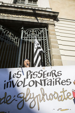Ecologist activists show their support to Daniel Cueff, Mayor of Langouet in Ille-et-Vilaine, before the administrative court of Rennes. He came to defend against the State the decision taken in his commune to reduce the use of pesticides. FRANCE - 21/08/2019.