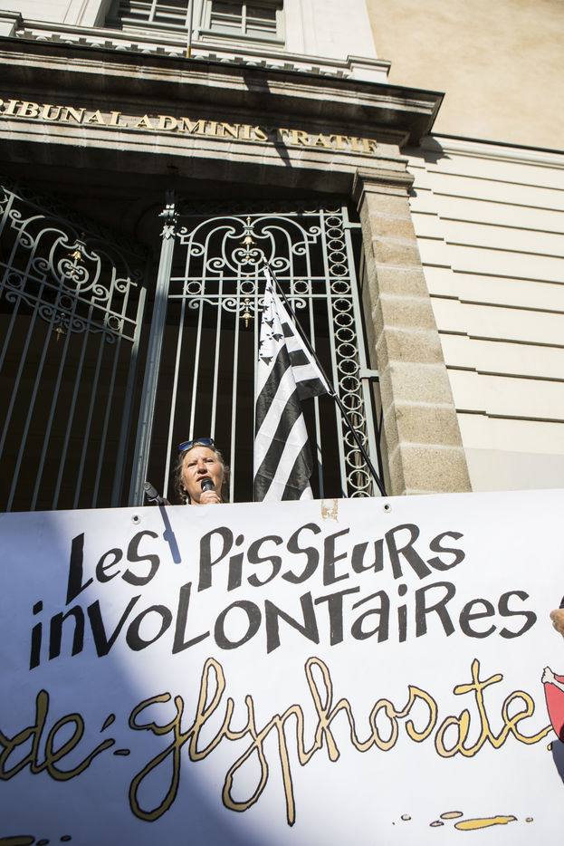 Des militants ecologistes manifestent leur soutien a Daniel Cueff, Maire de Langouet en Ille-et-Vilaine, devant le tribunal administratif de Rennes. Il est venu defendre contre l Etat l arrete pris dans sa commune visant a reduire l utilisation des pesticides. FRANCE - 21/08/2019.