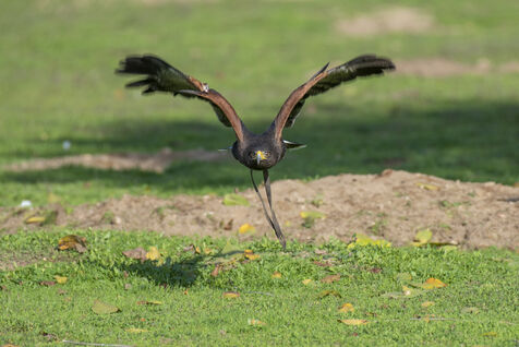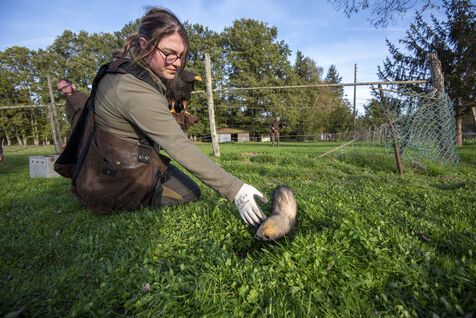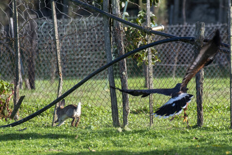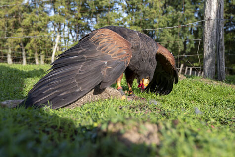 Falconers use Harris hawk and ferrets to hunt rabbits. Falconers intervene at the request of homeowners, often in areas close to dwellings where it is impossible to shoot rabbits. The ferrets are sent into the burrows to flush out the rabbits, which are then captured by the buzzards.