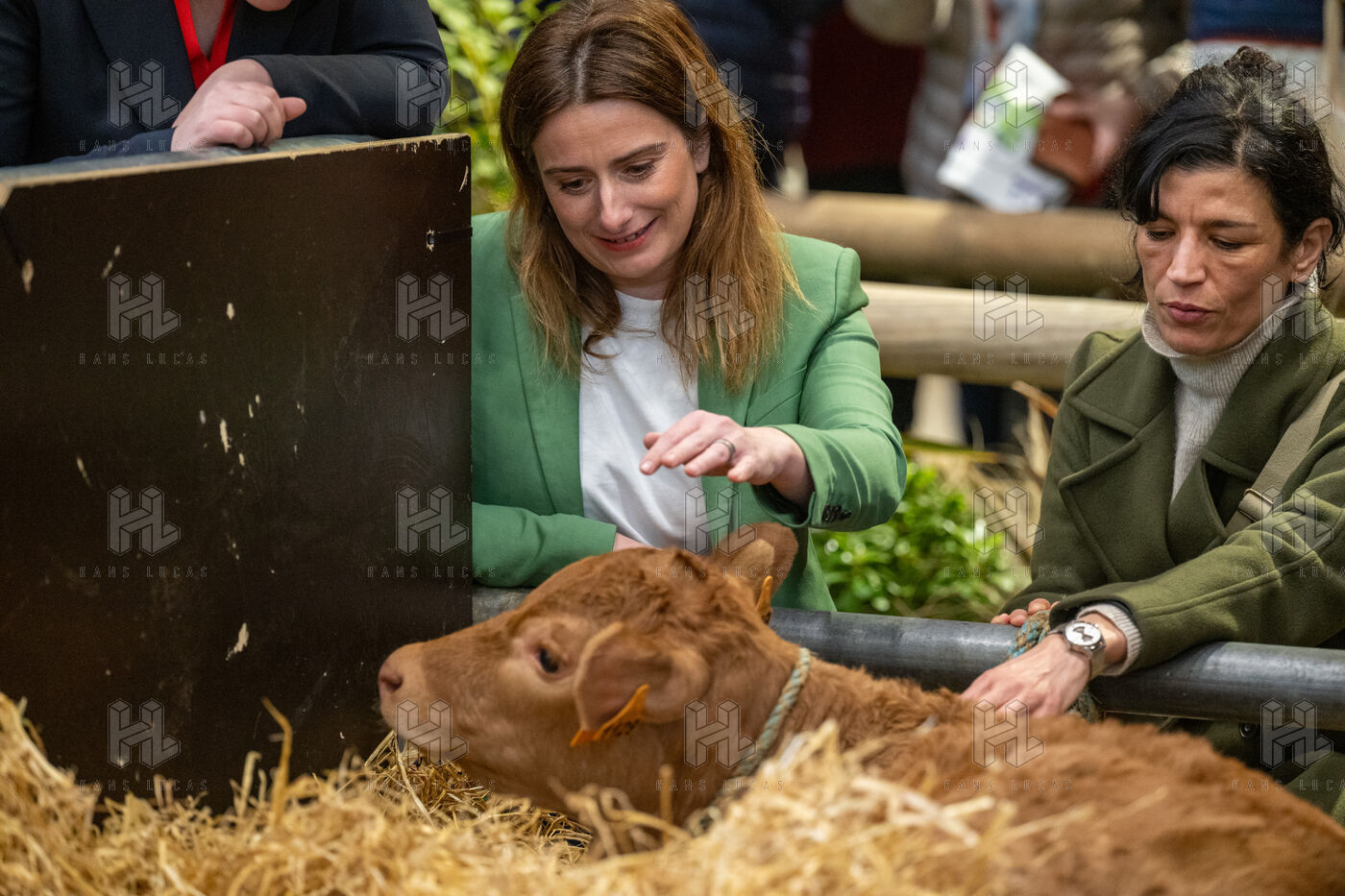 Marine Tondelier accompagnée de Benoit Biteau a visité le salon de l agriculture et a salué la vache égérie du salon : Oupette.