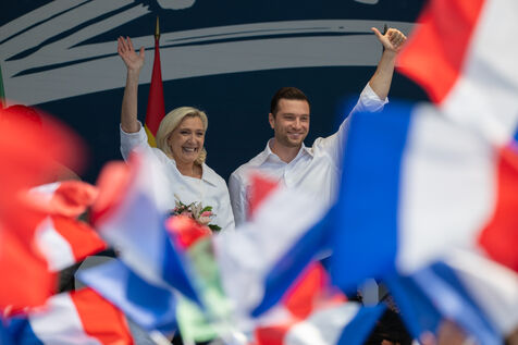 Marine Le Pen et Jordan Bardella lors de la fête de la victoire organisée pour célébrer le score des partis d'extrême droite aux élections européennes de 2024.