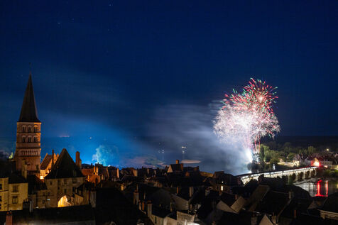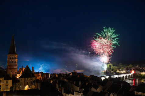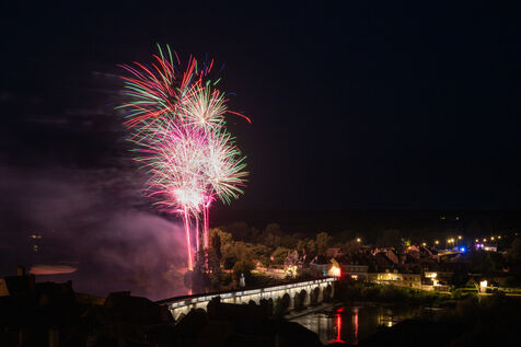 Fireworks display on 14 July along the banks of the Loire River in La Charité-sur-Loire.