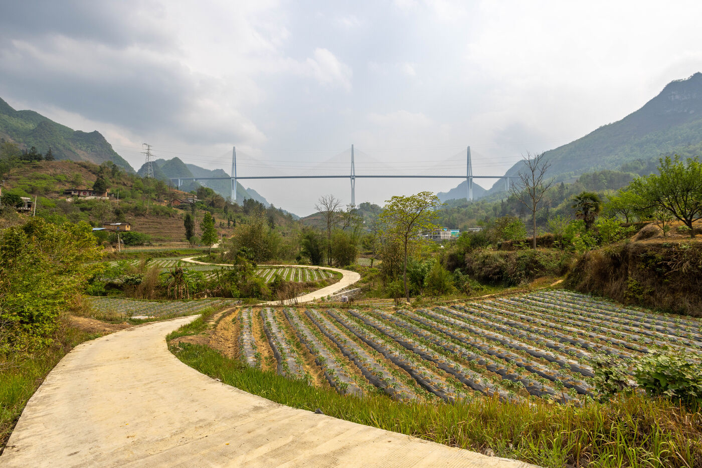 Au pied d'un super pont construit dans la province du Guizhou, les fermiers et la vie rurale est très peu affectée.