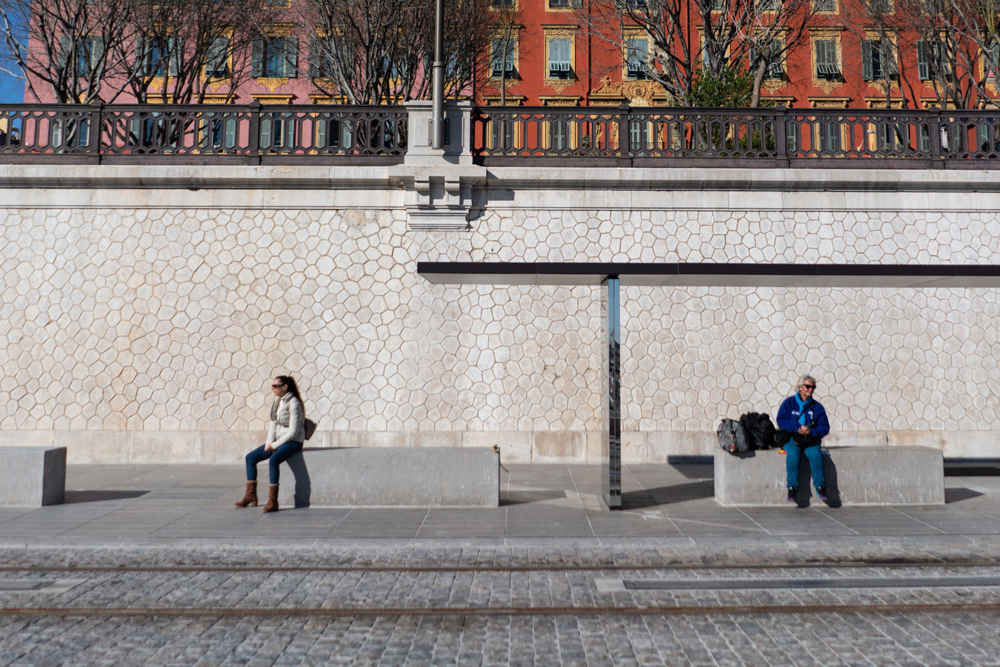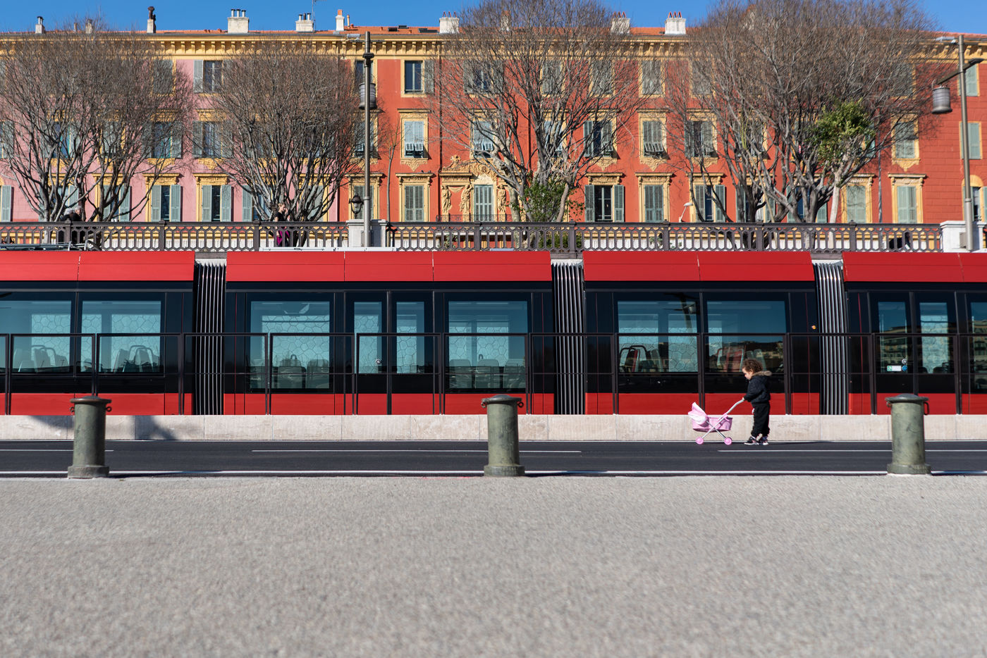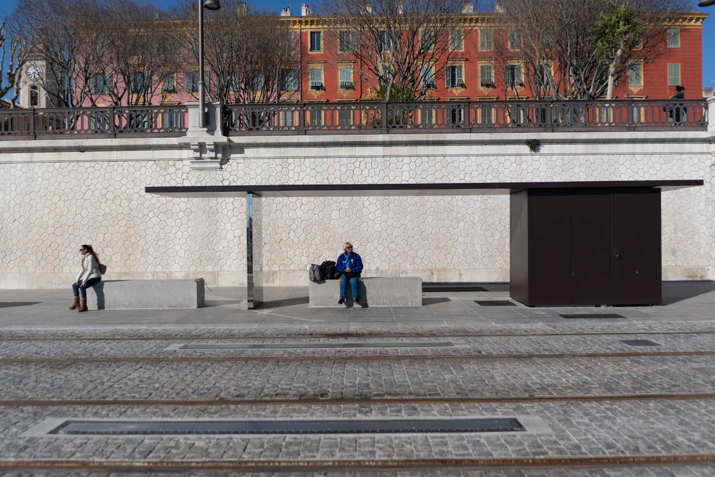 In Nice the tramway seems quite empty despite a few people waiting at the stop.