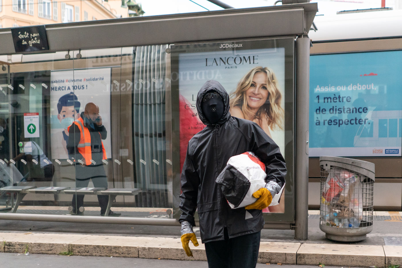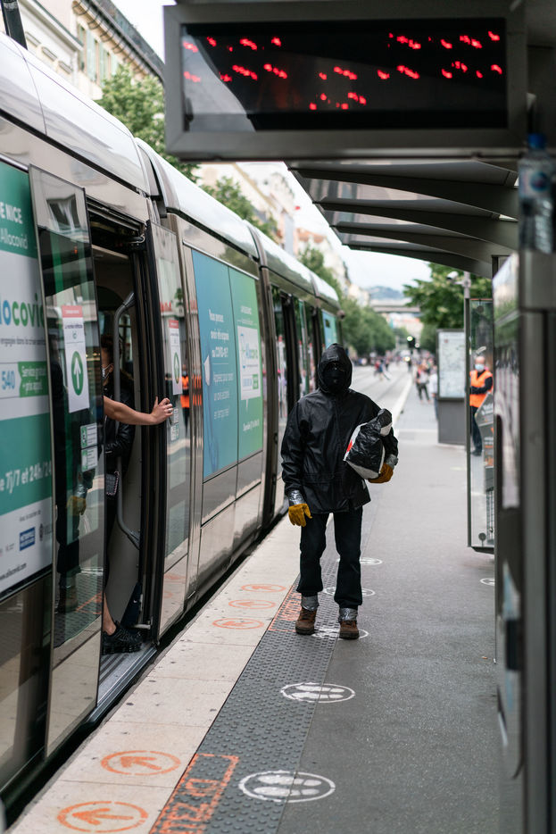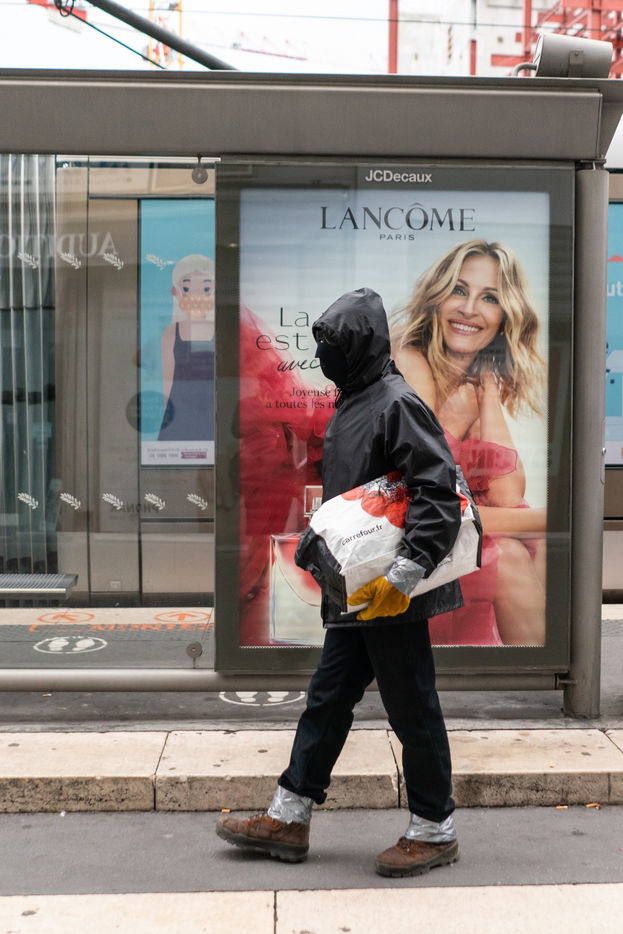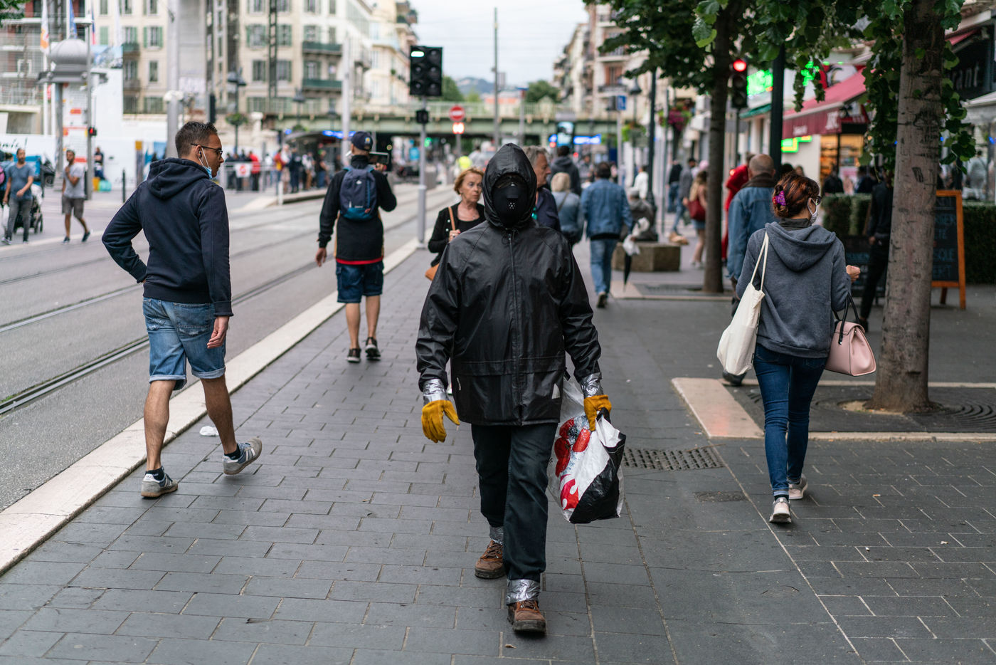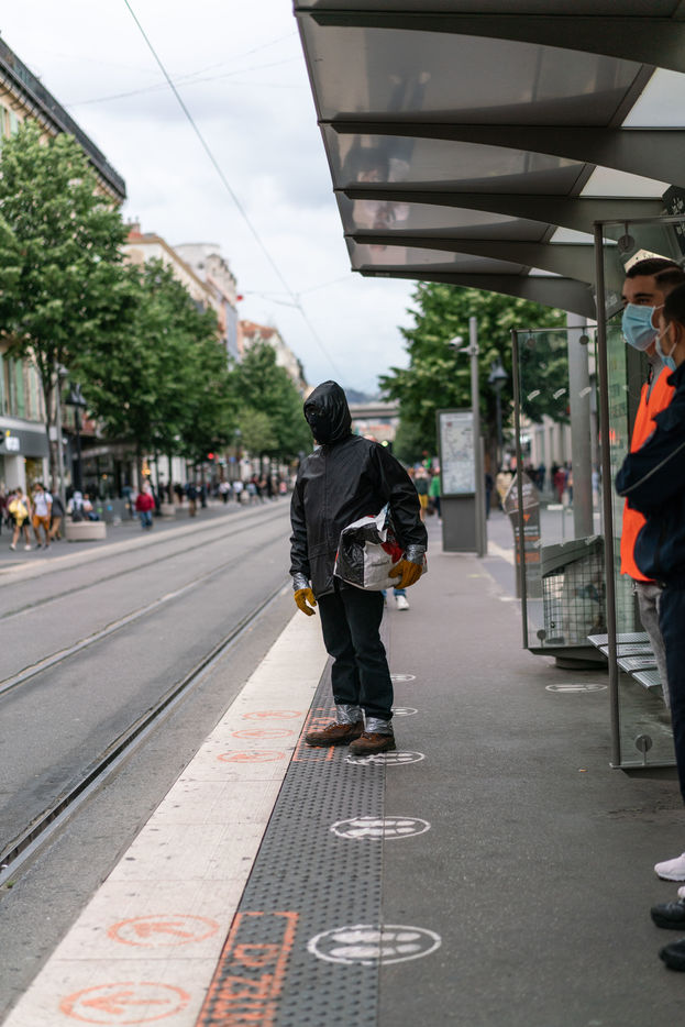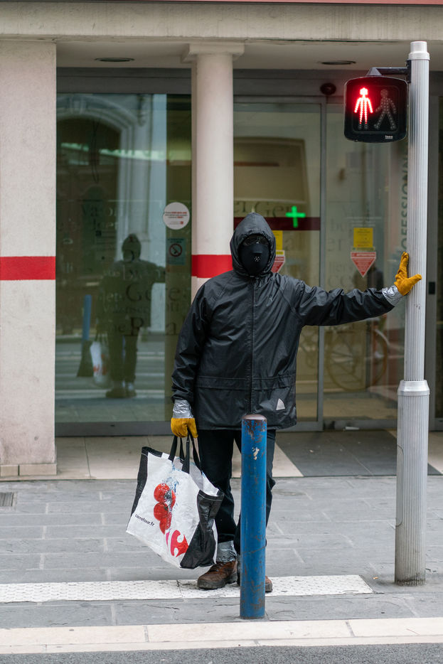 He has been circulating in the districts of Nice since the covid 19 crisis, but nobody knows who he is or why he has adopted this protection system consisting of 3 masks on top of each other, scootch on the wrists and calves, and black moonglasses. The inhabitants of the Notre Dame district nicknamed him Ratapignata man (the bat man in Nice). He never talks, doesn't answer when you talk to him, but I agreed to follow him for 1 hour in the center of Nice.