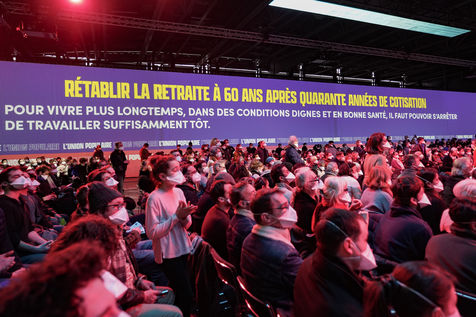 Dans le cadre de la campagne politique à l'élection présidentielle de 2022, Jean-Luc Mélenchon tient une réunion publique à Nantes, dimanche 16 janvier 2022. Ce meeting immersif et olfactif se veut une première mondiale.