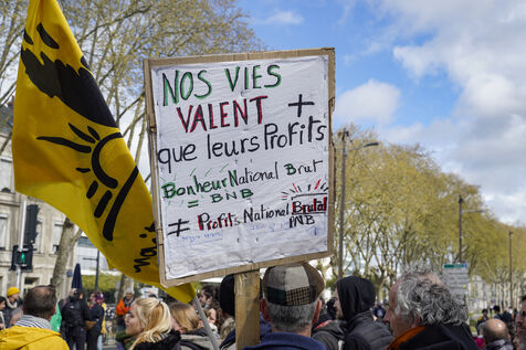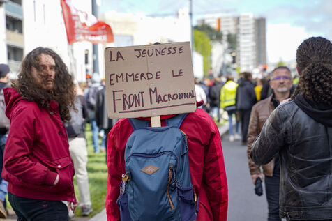 A la veille de la décision du Conseil constitutionnel, 5 000 manifestants selon les organisateurs, 3 500 selon la police, défilent dans les rues d'Angers, jeudi 13 avril 2023, lors de la douzième journée de mobilisation nationale contre la réforme des retraites. Quelques débordements ont encore émaillé le défilé.