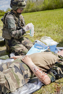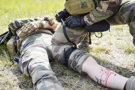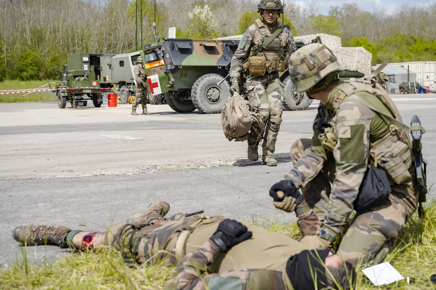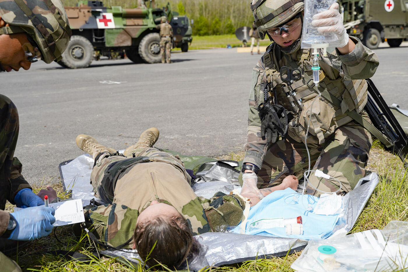 Lors de l'exercice ORION 23, un entraînement de « sauvetage au combat » est réalisé par le service de santé des armées, le 2 mai 2023. Des blessures ont été simulés sur des militaires afin de rendre l'exercice plus réaliste pour ceux qui interviennent et portent les premiers secours, en vue d'évacuer les blessés.