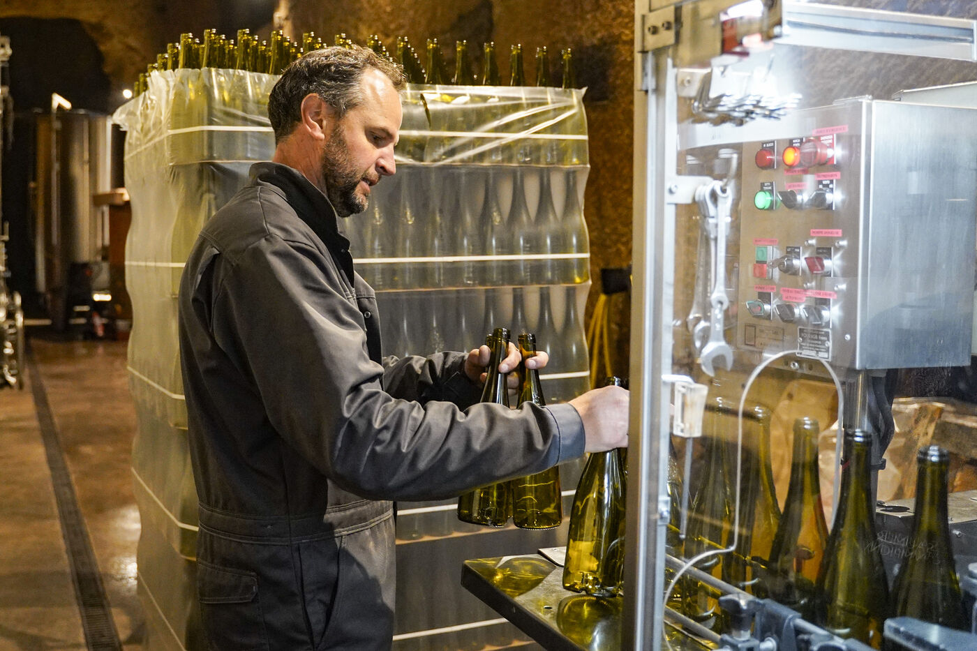 Prestataire auprès de plusieurs vignerons indépendants du Val de Loire, Davy est embouteilleur depuis plus d’une vingtaine d’années. Ce matin, c’est 60 hectolitres de vin de Saumur-Champigny, du millésime 2023, qu’il met en bouteille à la propriété d'un viticulteur du Saumurois. Pour cela, il a placé son monobloc de tirage près des cuves à vin entreposées dans le chai situé à l'intérieur d'une cave de tuffeau. Pour ce travail, il est aidé de deux ouvriers agricoles de la propriété.