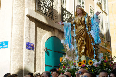 Chaque 15 août, dans le quartier du Panier à Marseille, il y a la procession de l'Assomption, une tradition populaire dont les origines remontent au début du XIXe siècle. Après la messe célébrée à la Cathédrale de la Major, la statue dorée de la Vierge Marie est portée en procession à travers les ruelles étroites du Panier. Les habitants, fidèles et visiteurs se rassemblent le long du parcours, certains offrant des mouchoirs pour effleurer le manteau de la Vierge, geste de dévotion transmis de génération en génération. Cette fête mariale, ancrée dans la tradition des habitants du Panier, est un moment de rassemblement particulièrement pour la communauté italienne et corse, anciennes communautés qui ont longtemps habité le quartier.