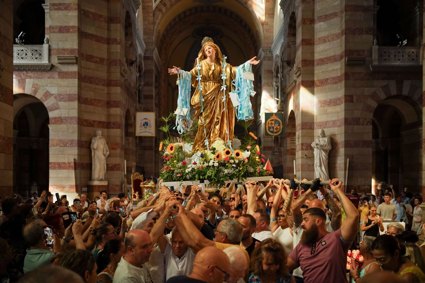 Every 15 August, in the Panier district of Marseille, there is the procession of the Assumption, a popular tradition whose origins date back to the early 19th century. After the mass celebrated at the Cathedral of the Major, the golden statue of the Virgin Mary is carried in procession through the narrow streets of the Panier. The inhabitants, faithful and visitors gather along the route, some offering handkerchiefs to brush against the Virgin’s cloak, a gesture of devotion passed down from generation to generation. This Marian feast, rooted in the tradition of the inhabitants of the Panier, is a moment of gathering particularly for the Italian and Corsican community, former communities who have long inhabited the neighborhood.